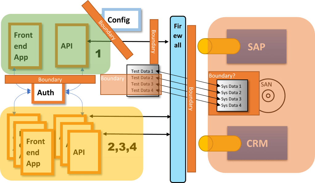 Let’s look at an example system. We will use an example where four apps are all hitting the same shared SAP and CRM system, all using shared auth. Let’s assume the developers and testers only have access to application 1. How do they handle all the items listed above?